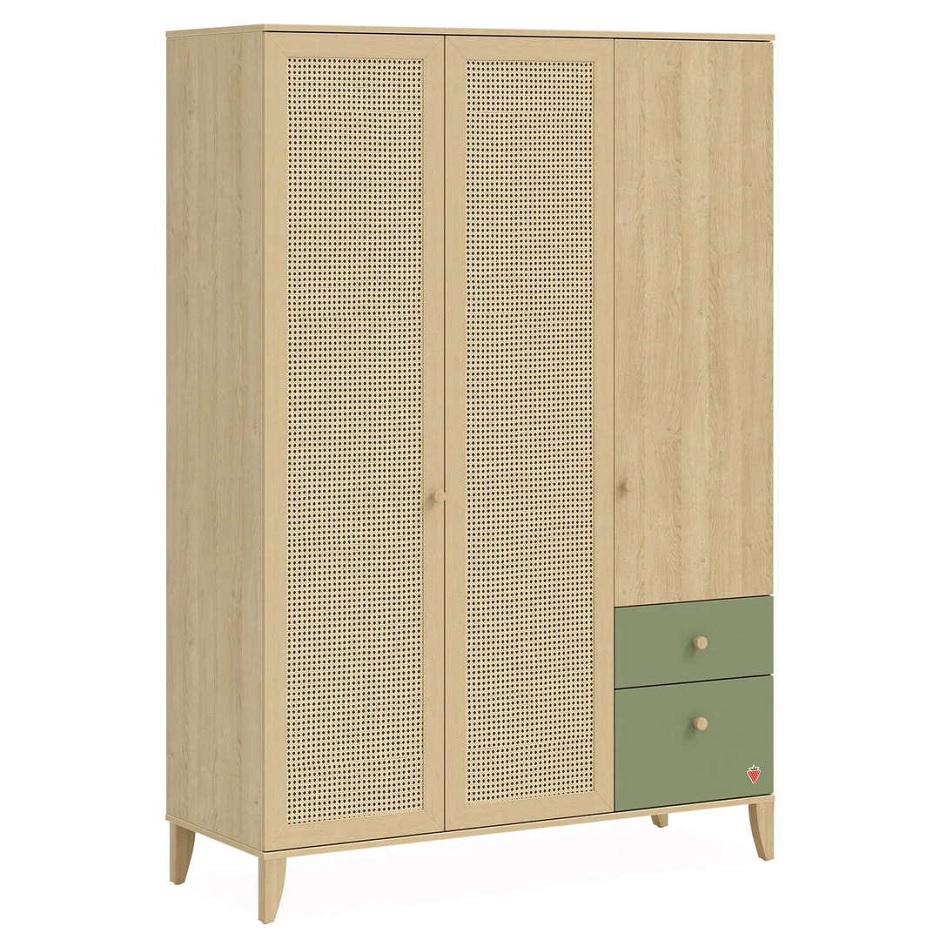 Der Loof Kleiderschrank bietet viel Stauraum für Kleidung und Accessoires und hilft dabei, Ordnung im Kinderzimmer zu halten. Mit seiner Kombination aus Holzoptik und modernen olivgrünen Schubladen fügt er sich perfekt in die Scandi-Boho-Ästhetik ein. Die durchdachte Einteilung des Kinderschrankes sorgt dafür, dass alles seinen Platz findet. Die geflochtenen Türfronten verleihen dem Möbelstück von Cilek eine handwerkliche Note. Der Schrank bietet drei Türen.