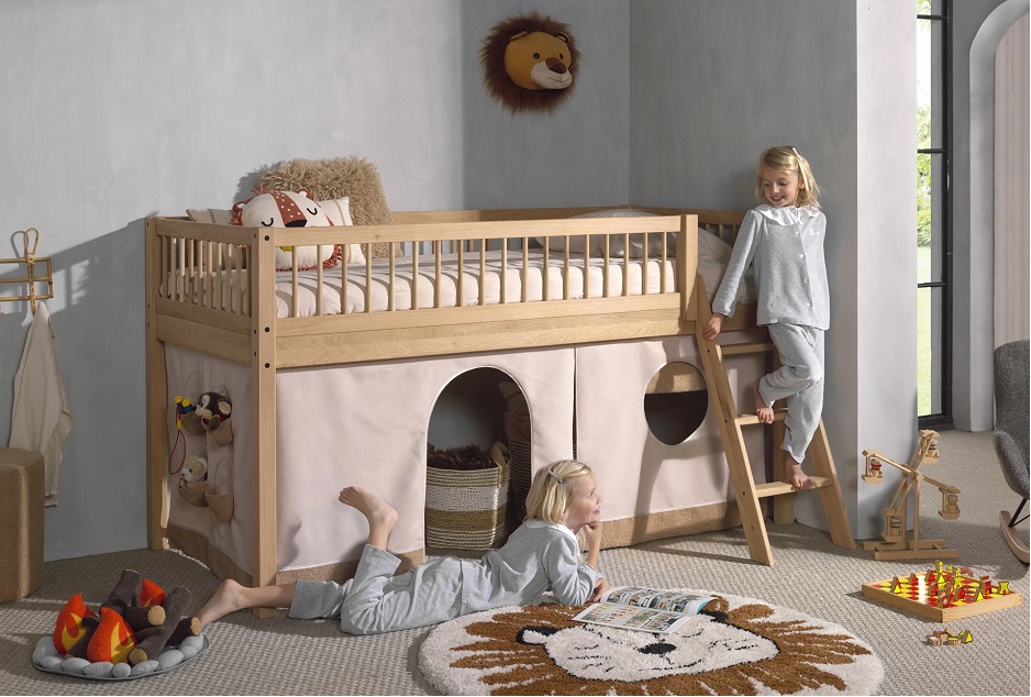Ein eindrucksvolles Beispiel dafür ist das Hochbett Forrest von Vipack. Das Kinderbett ist gefertigt aus hochwertiger Eiche und verleiht dem Raum mit warmer Holzstruktur und rustikaler Ausstrahlung Geborgenheit und eine organische Atmosphäre. Mit seinem belgischen Design, der hochwertigen Verarbeitung und seiner zeitlosen Optik zeigt das Forrest Hochbett, wie Holzmöbel und Deko zu einem harmonischen, stilvollen und zugleich verspielten Raumkonzept verbinden kann. Ergänzt durch einen liebevoll gestalteten Spielvorhang, kombiniert dieses Bett natürliche Materialien mit kindgerechter Fantasie.