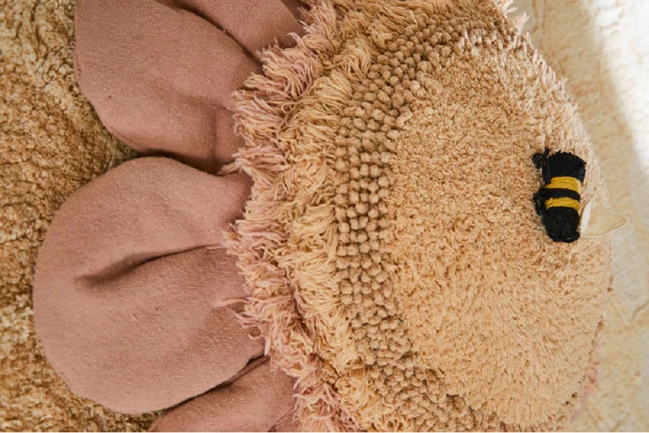 Ein bezauberndes Beispiel für den Bodenbereich ist das Sitzkissen Pink Daisy von Lorena Canals. Dabei handelt es sich um ein handgefertigtes Bodenkissen in Blütenform. Mit rosafarbenen Baumwoll-Canvas-Blättern und einer goldenen, strukturierten Chenille-Mitte setzt es nicht nur einen dekorativen Farbakzent, sondern bringt auch Wärme, Sanftheit und eine spielerische Note in den Raum. So ist es perfekt zum Lesen, Spielen oder Entspannen und ideal, wenn man eine gemütliche Farbwelt unterstreichen möchte.