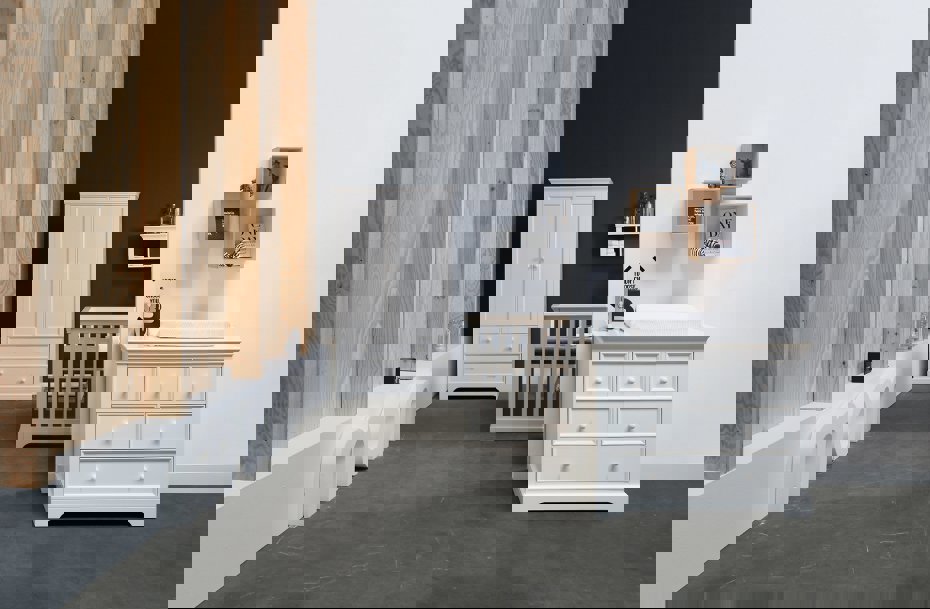 Dieses Babyzimmer-Set mit einem aussergewöhnlichen Design erinnert an französische Strandhäuser und bietet neben harmonischer Wohlfühl-Atmosphäre auch Sicherheit und Gesundheit durch massiven Kiefernholz. Kein Zufall, dass dieses mitwachsende Set als Diamant der Möbelindustrie bezeichnet wird.