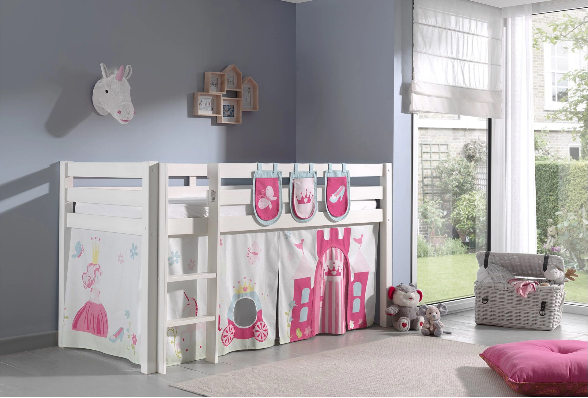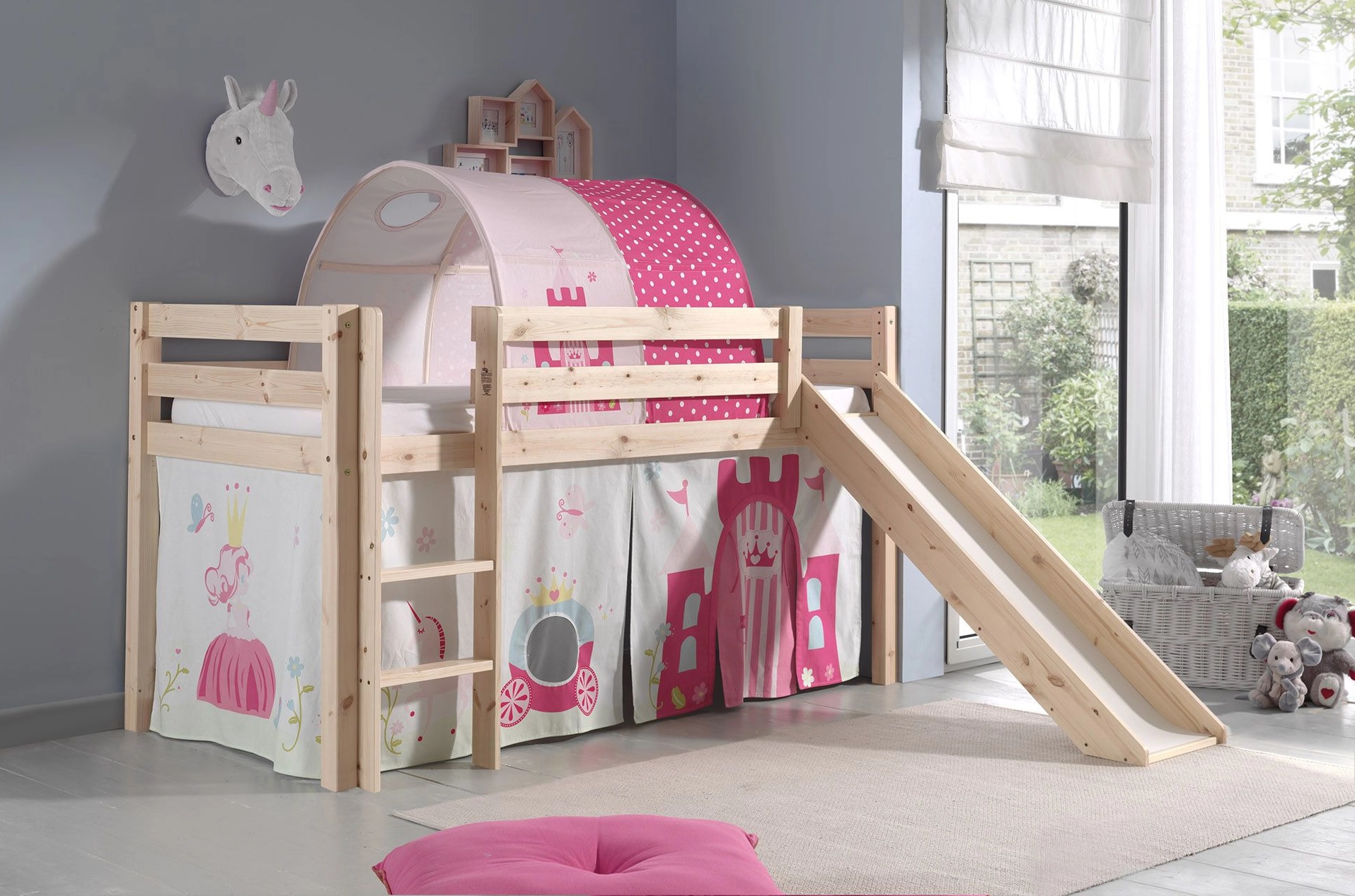 Für noch mehr Abenteuer sorgen der Spielvorhang Princess oder die Höhle Princess Pino von Vipack. Wenn Ihre Tochter über ein Hochbett verfügt, entsteht mit dem Spielvorhang unter dem Schlafhochbett ein geheimer Rückzugsort, in dem Geschichten lebendig werden. Mit der Höhle hat sie auf dem Bett zusätzlich einen gemütlichen Ort zum Lesen, Träumen und Spielen. Ein kleines Reich ganz für sich allein.