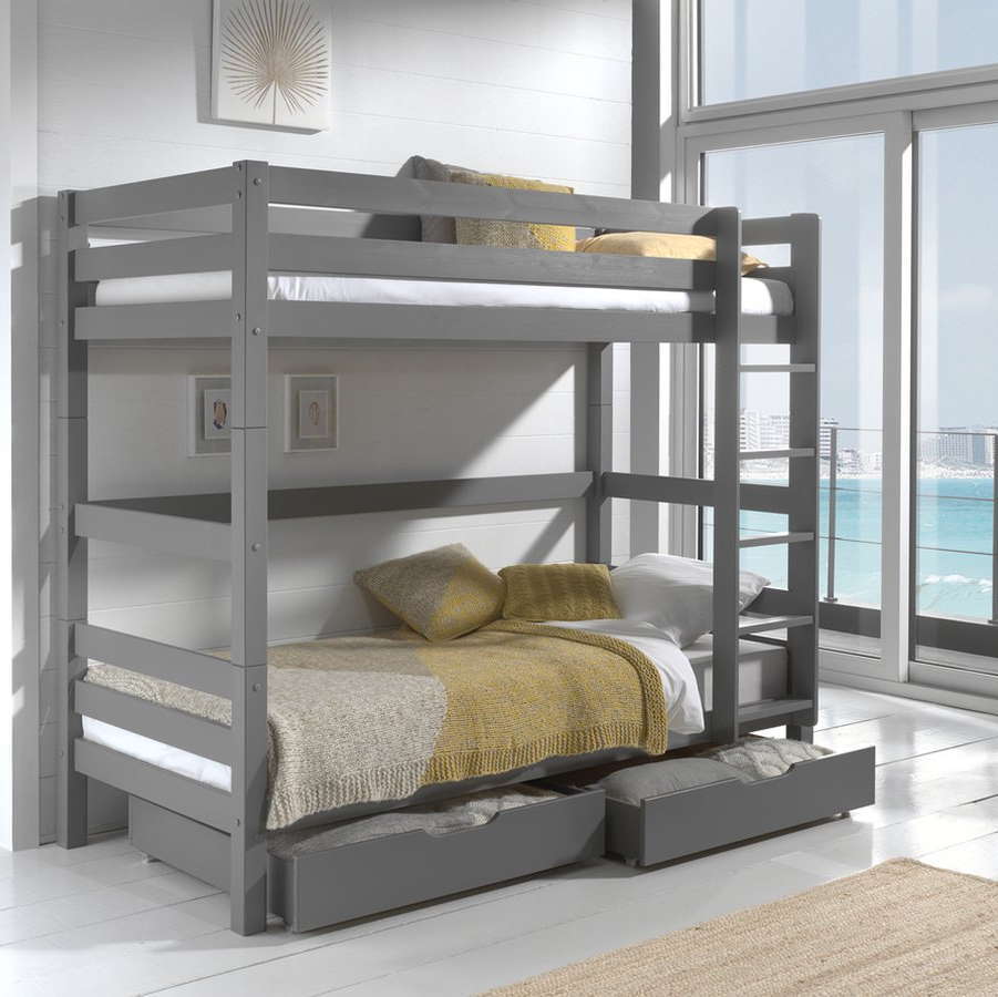 Dieses Vipack-Familienbett von PINO besteht aus skandinavischem Kiefernholz und ist naturlackiert. Dies ist ein Etagenbett, dessen oberes Bett 90 x 200 cm und dessen unteres Bett 140 x 200 cm gross ist.