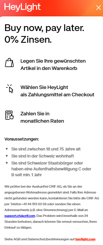 Details Heylight: ab 500 CHF verfügbar. 500 CHF - 1000 CHF 3 oder 4 Raten, 1001 CHF - 2400 CHF 3,4,6 oder 10 Raten, ab 2401 CHF 3,4,6,10 oder 12 Raten